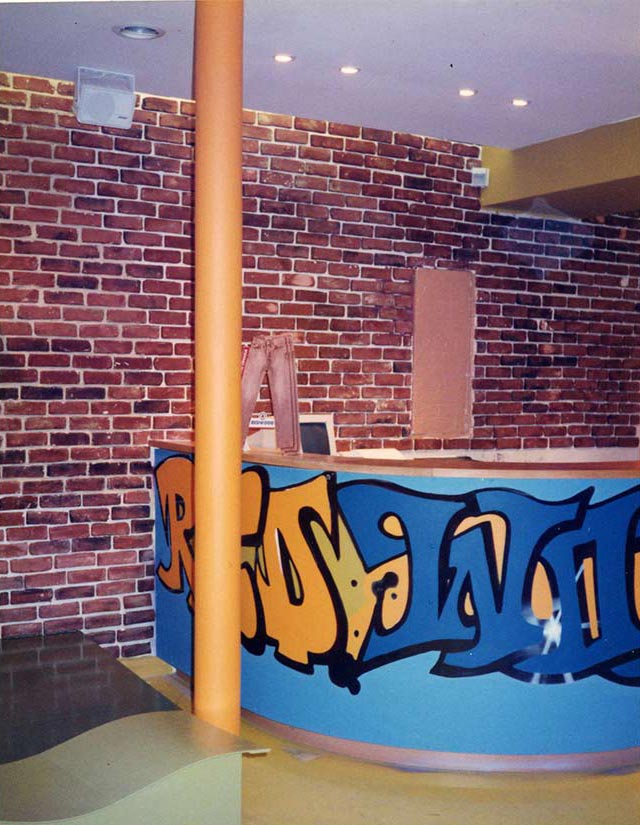 Étude Réalisation Aménagement Agencement: mur d’images, espace cabines et caisse centrale, plafonds, création de tags et fresques. Réalisation de la façade et lettrages.