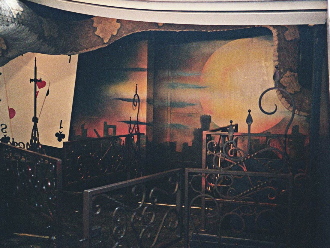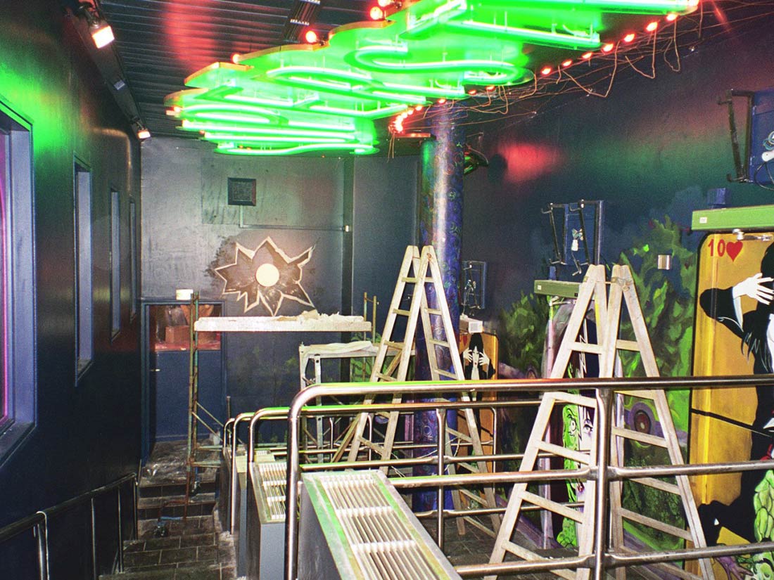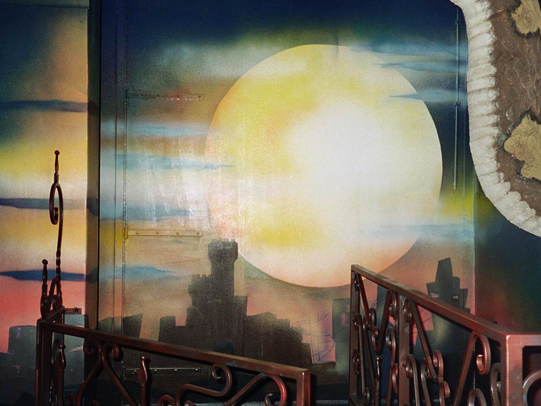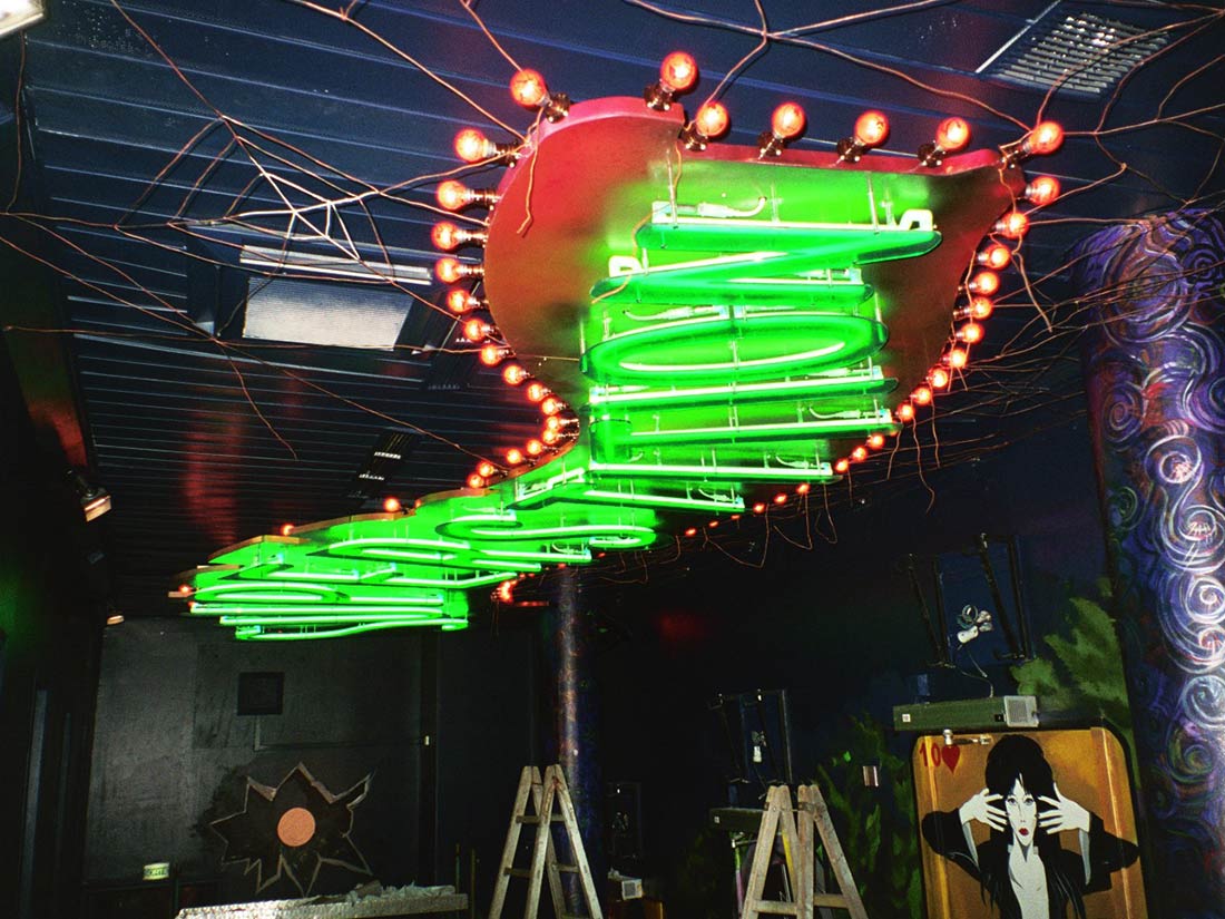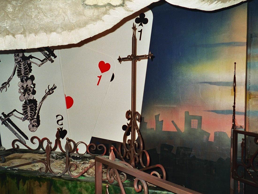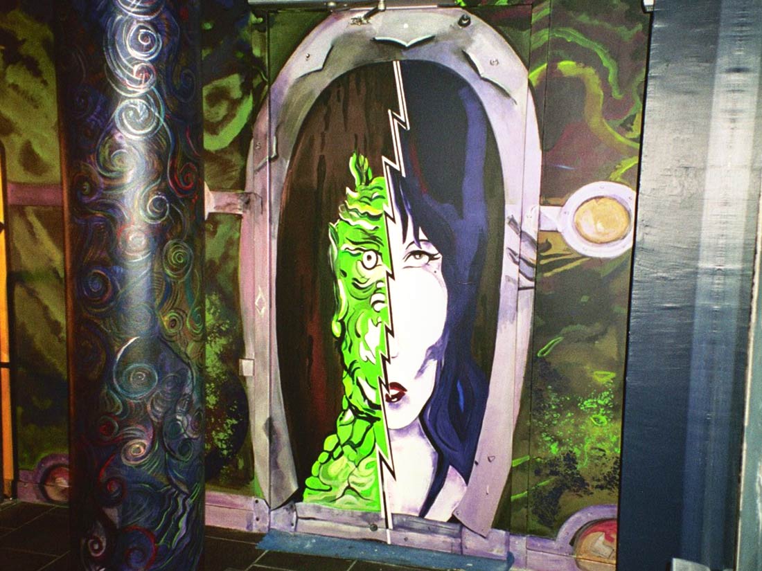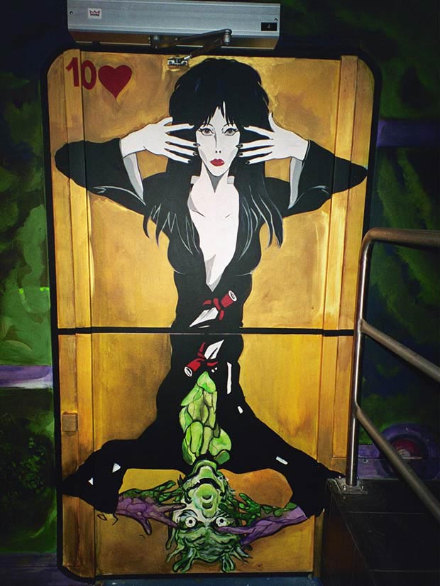 Réalisation décors et fresques d’après projet d’architecte. Cinéma thème Elvira, gardes-corps, mosaïque, jeu de carte PVC. Espace extérieur et intérieur.