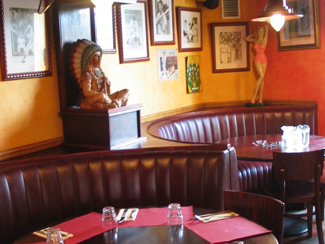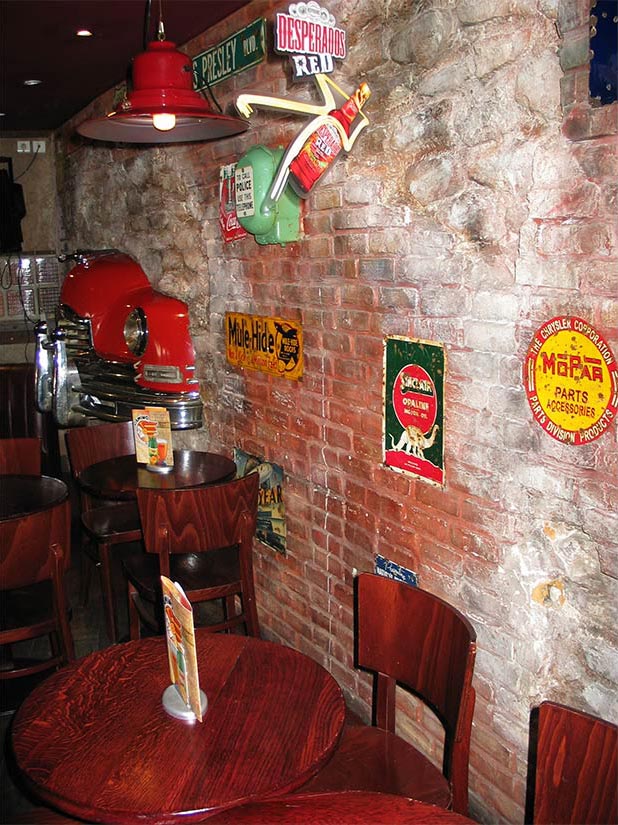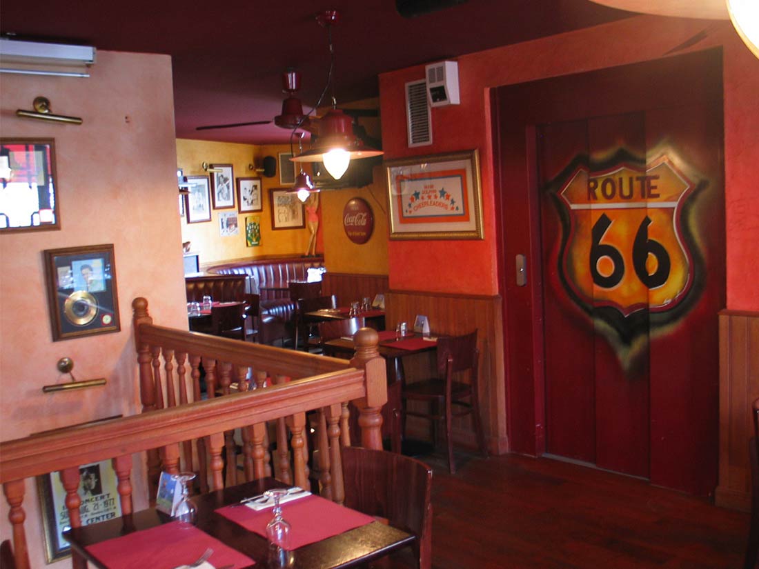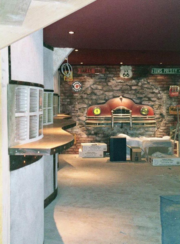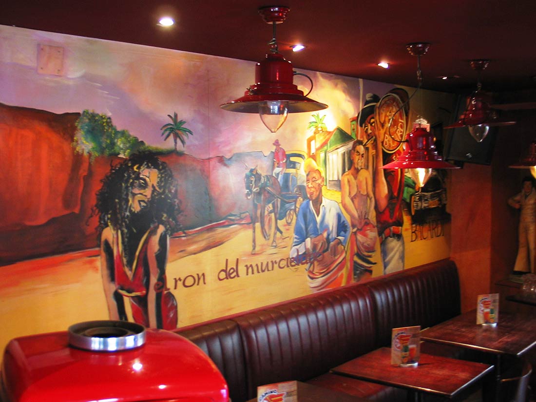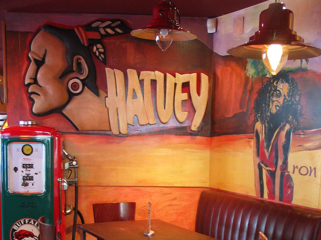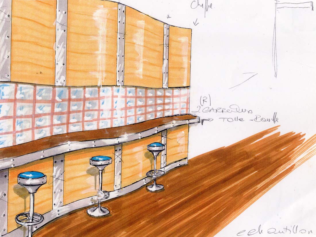 Étude Réalisation Aménagement Agencement Espace Intérieur sur 2 niveaux. Mise en place décors: comptoir, mur courbe, canapé alcôve, garde-corps, fausses briques, choix mobiliers. Fresques et peinture dans l’ensemble du volume.