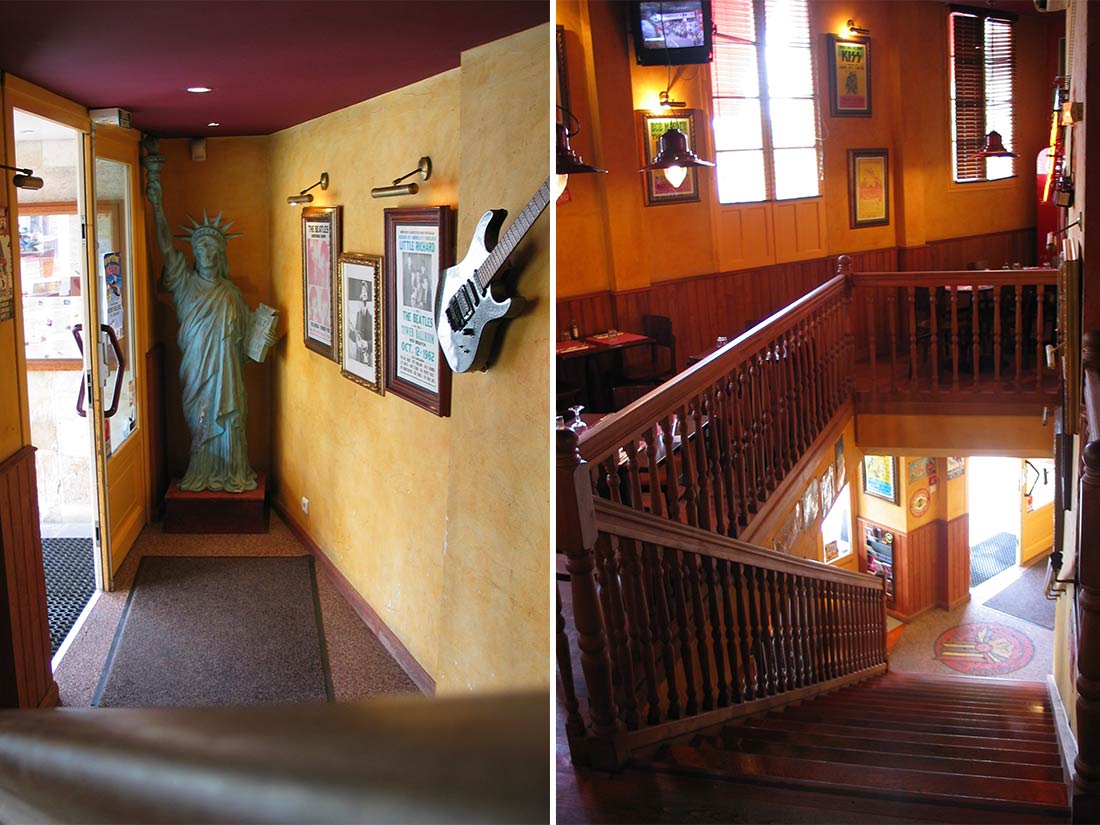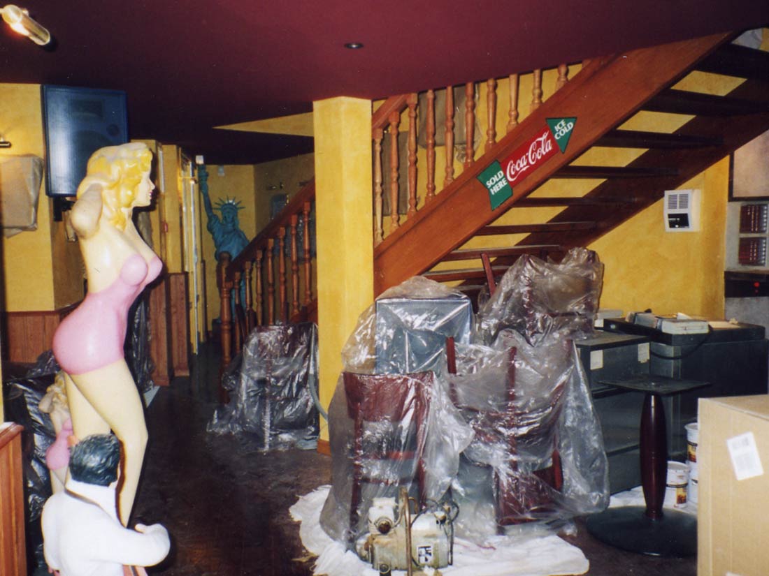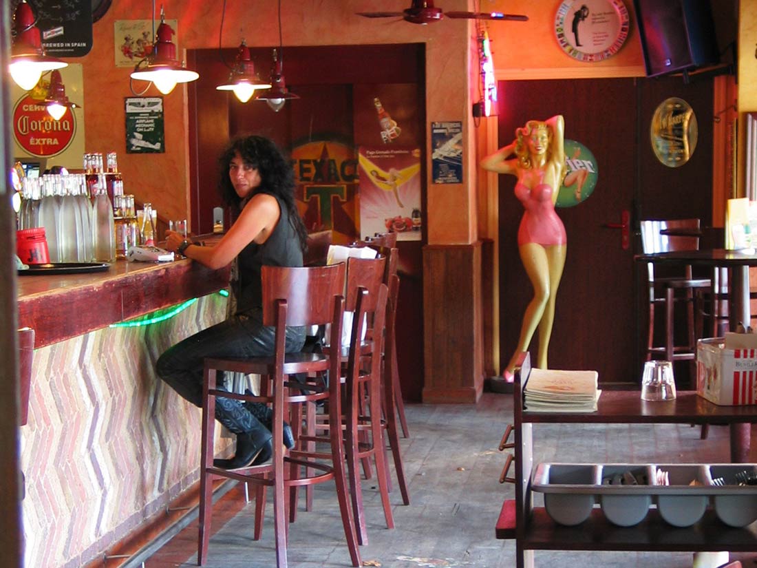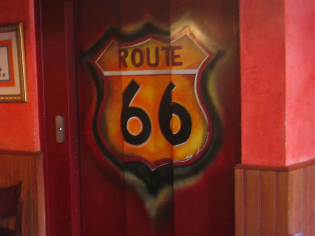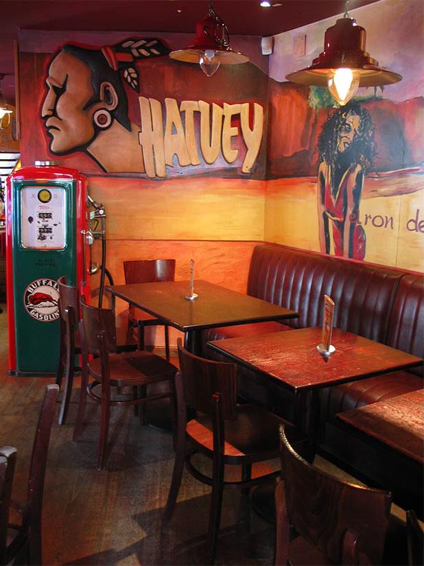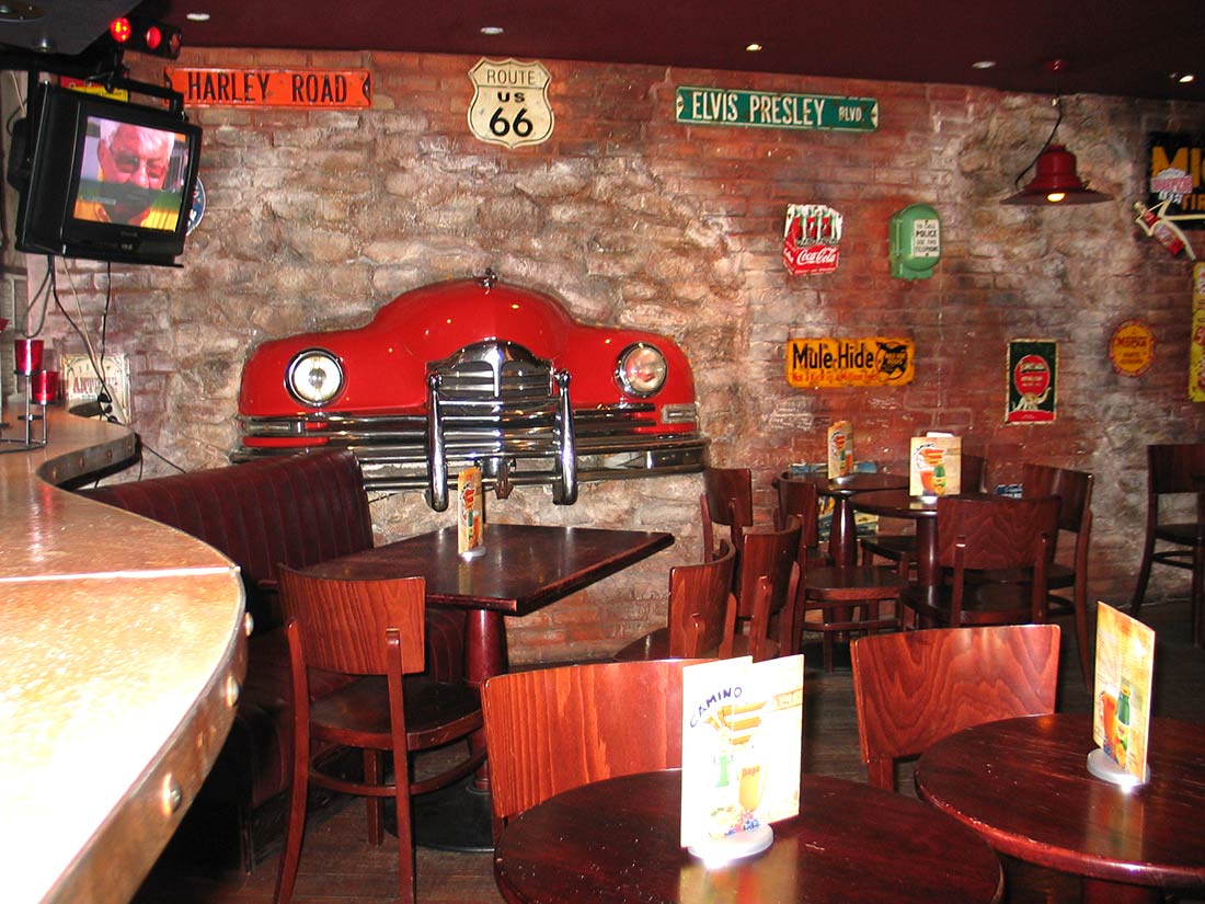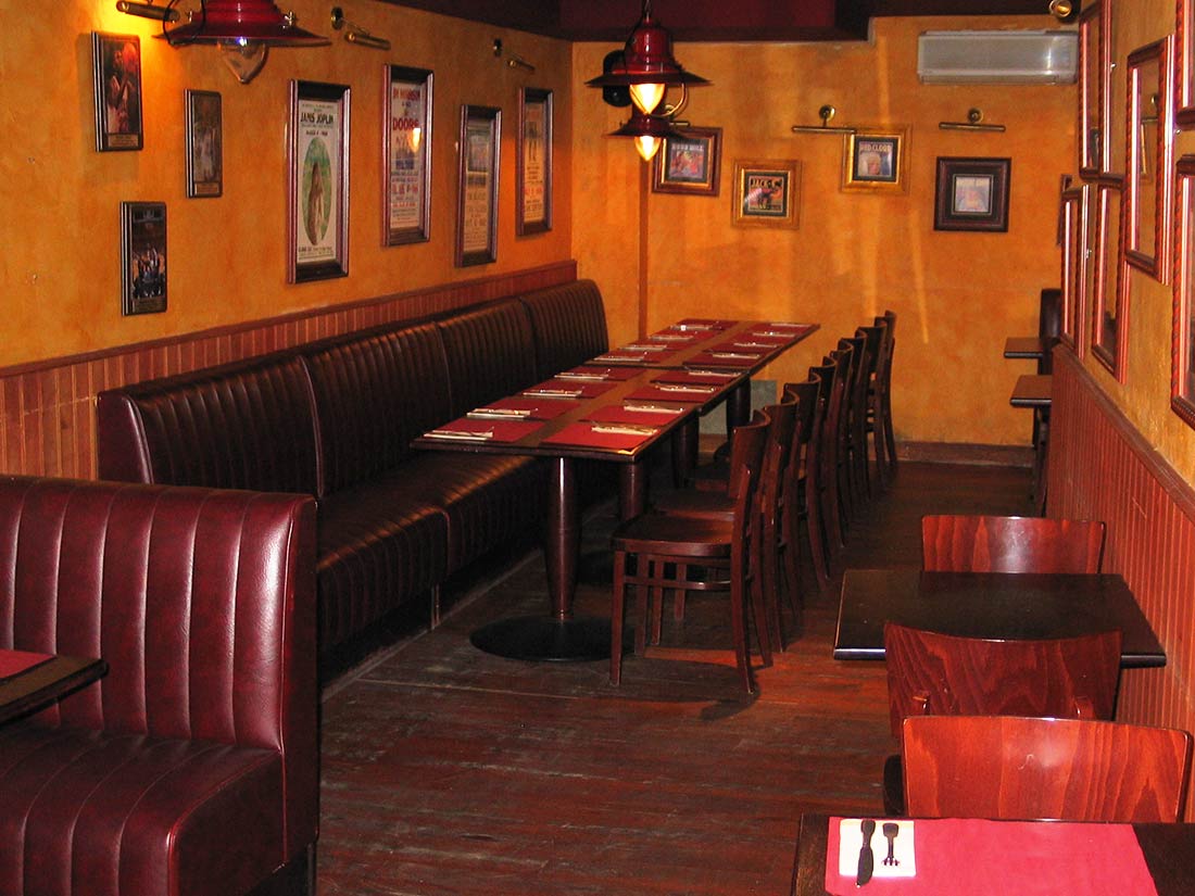 Étude Réalisation Aménagement Agencement Espace Intérieur sur 2 niveaux. Mise en place décors: comptoir, mur courbe, canapé alcôve, garde-corps, fausses briques, choix mobiliers. Fresques et peinture dans l’ensemble du volume.