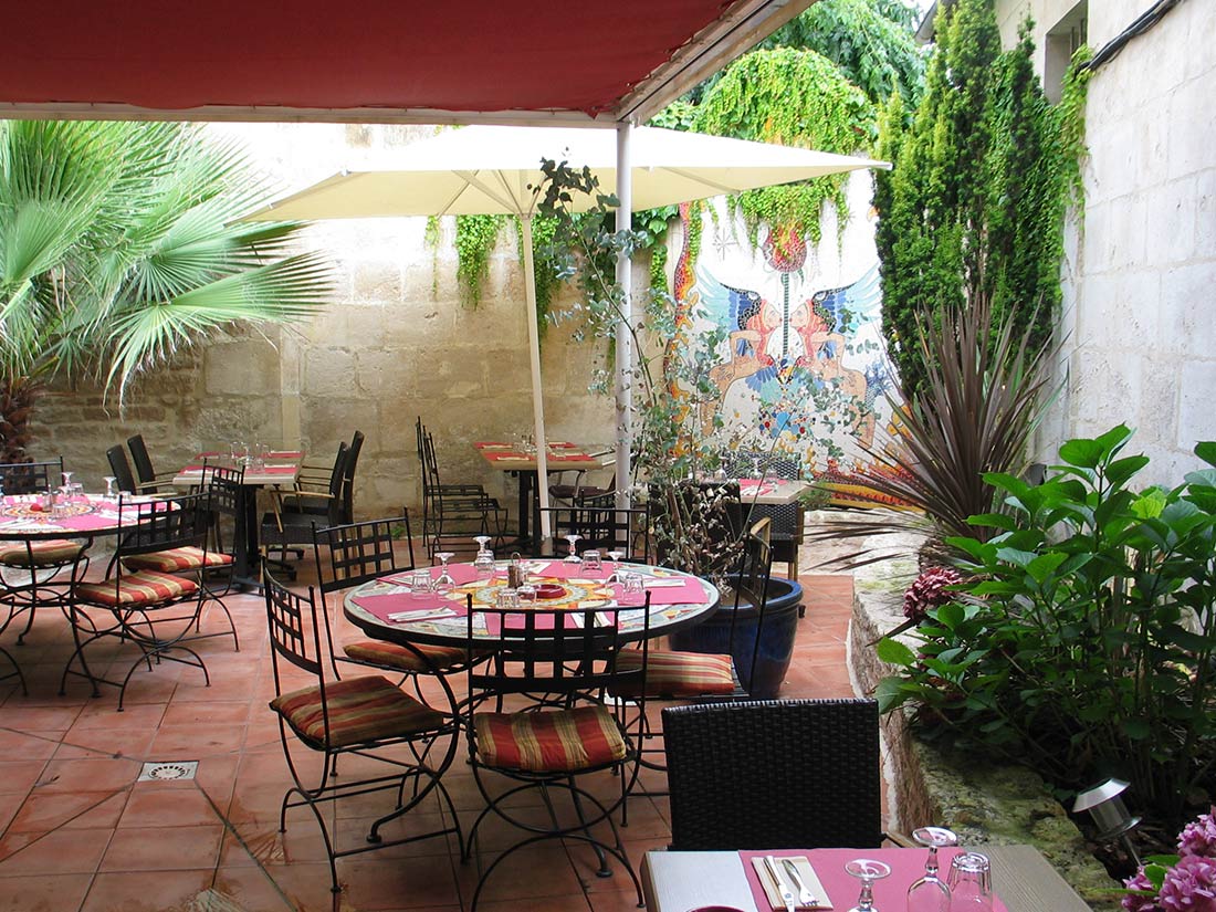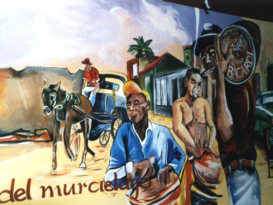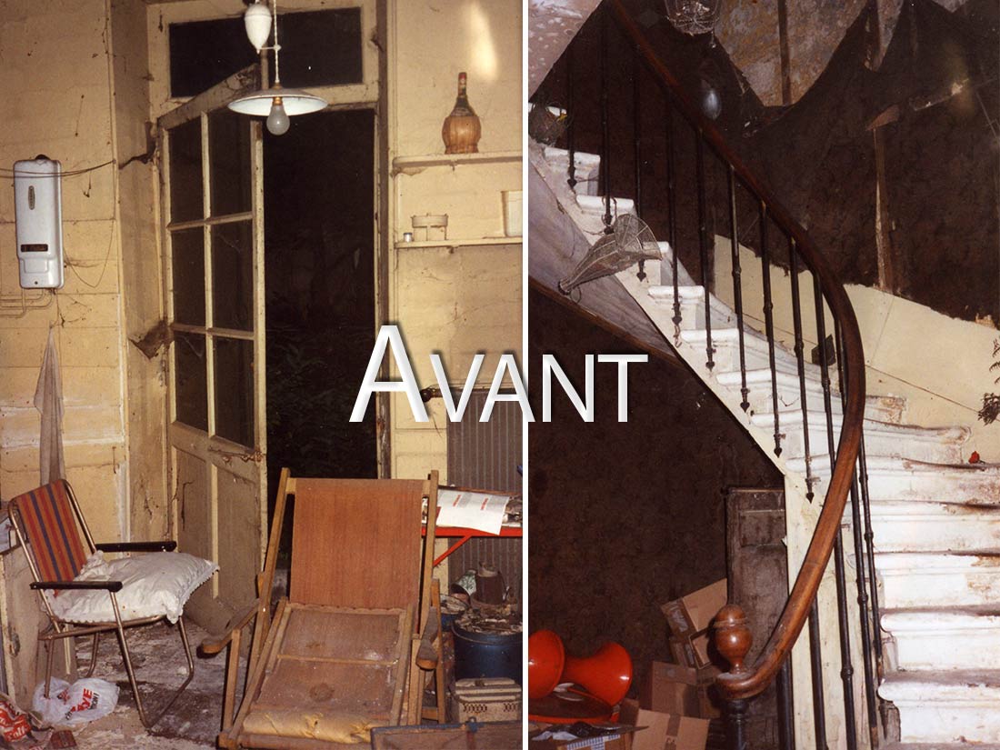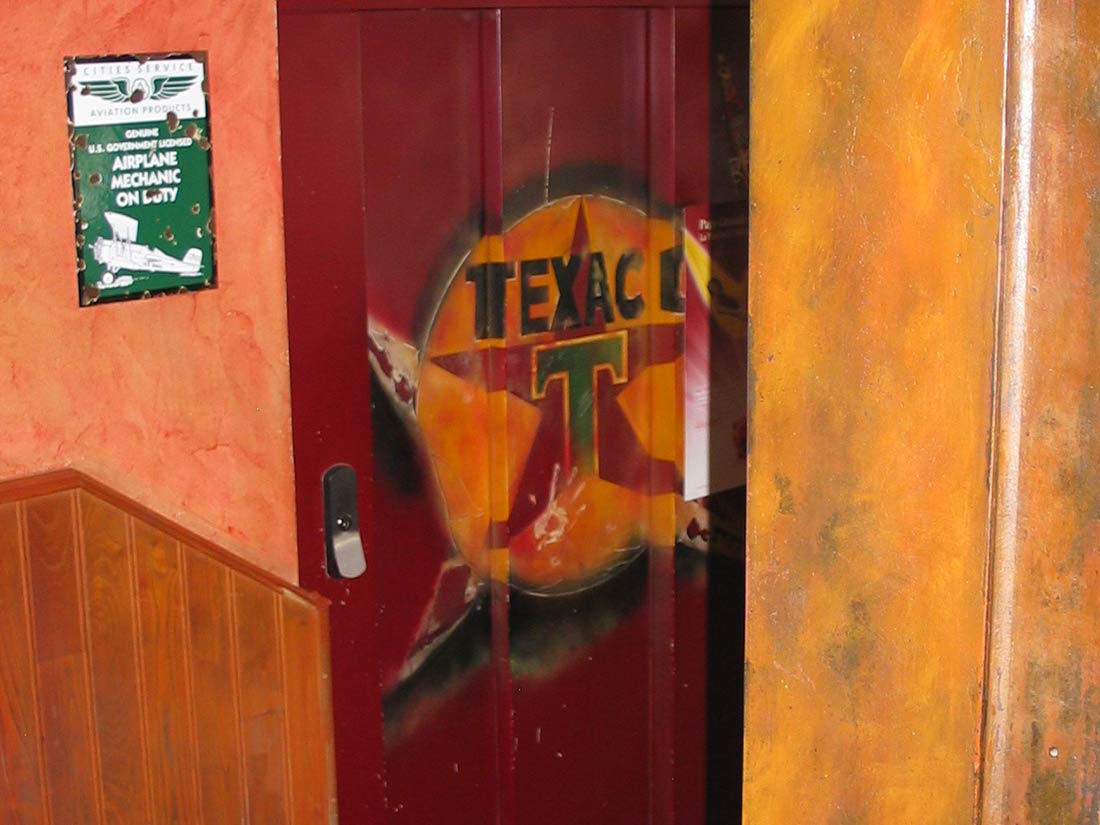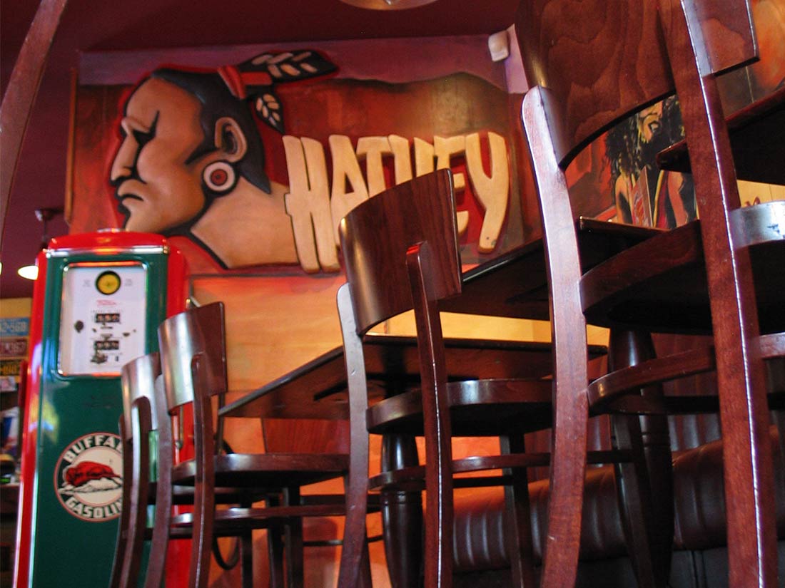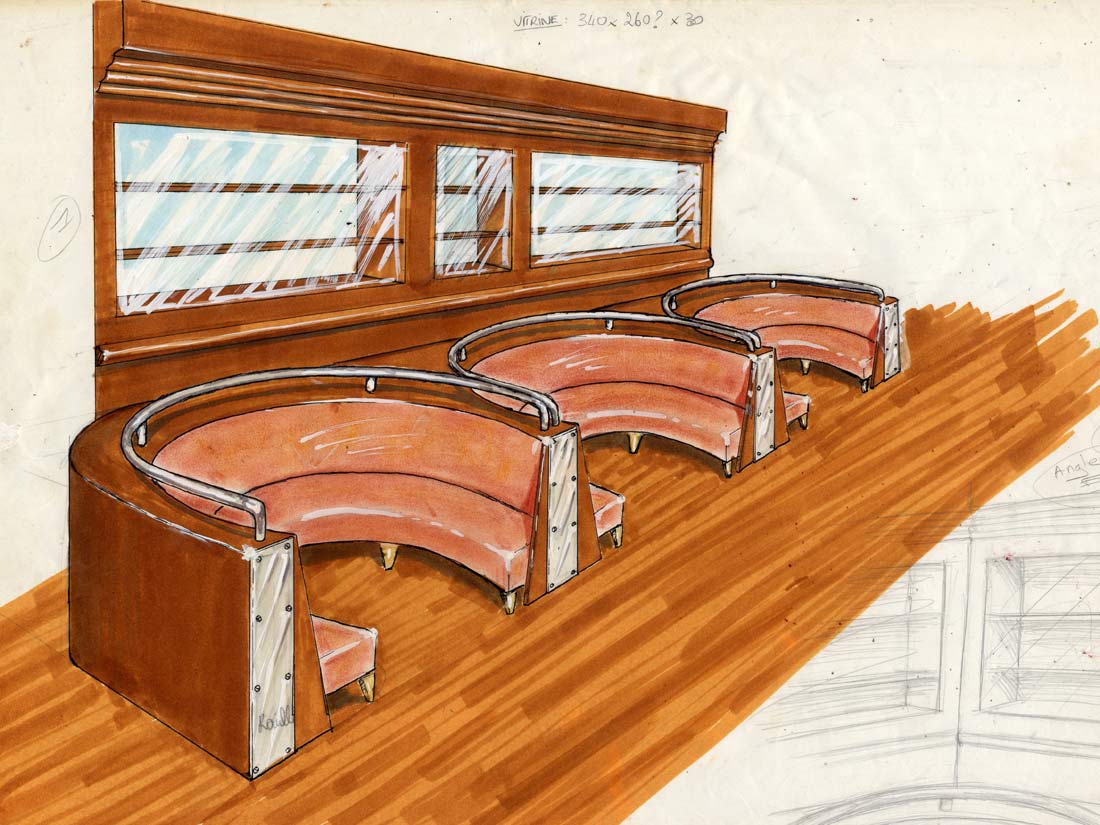 Étude Réalisation Aménagement Agencement Espace Intérieur sur 2 niveaux. Mise en place décors: comptoir, mur courbe, canapé alcôve, garde-corps, fausses briques, choix mobiliers. Fresques et peinture dans l’ensemble du volume.